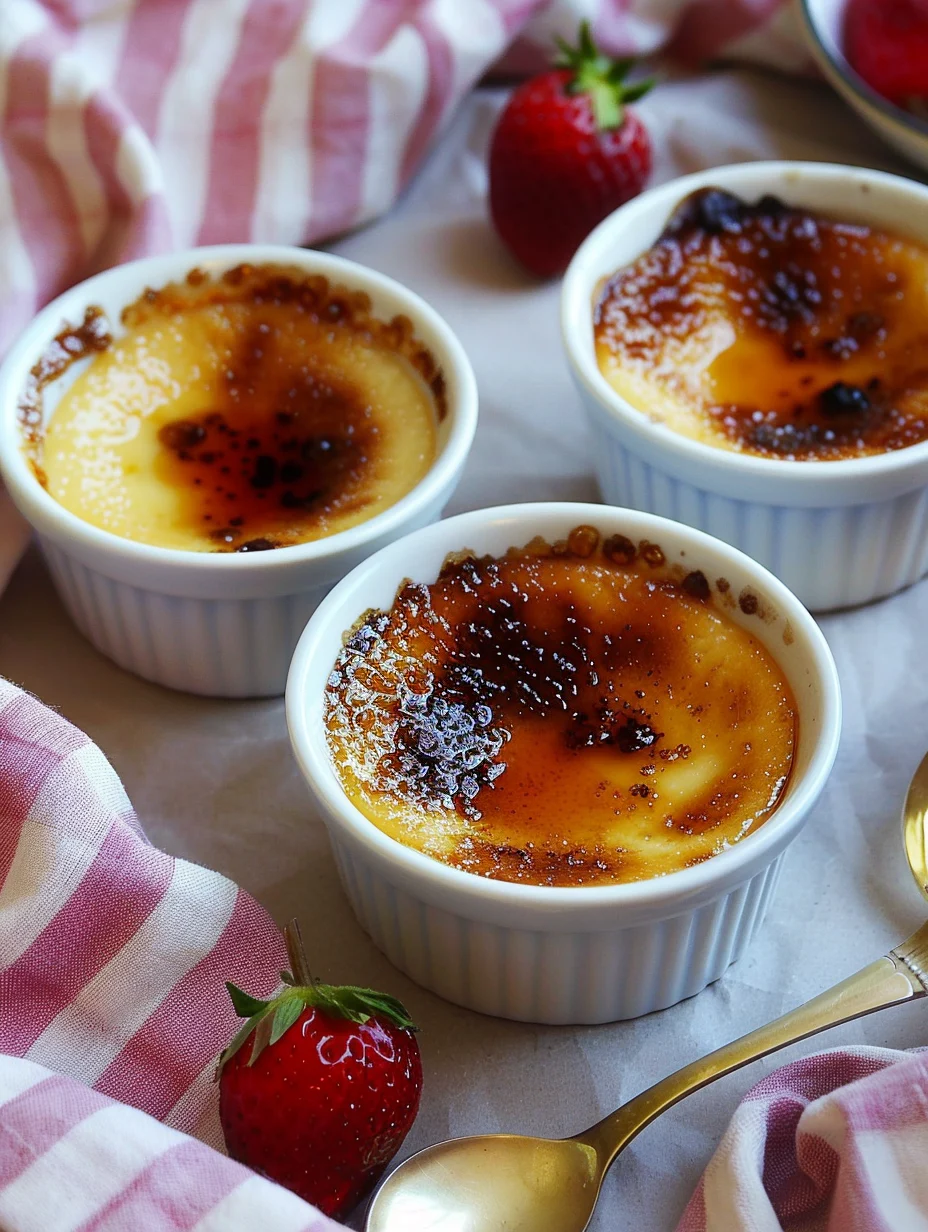 10. Caramelize Sugar: Before serving, sprinkle a thin layer of sugar over the top of each custard. Use a kitchen torch to caramelize the sugar until it’s golden and crisp. If you don’t have a torch, you can place the ramekins under a broiler for a few minutes, watching carefully to prevent burning.