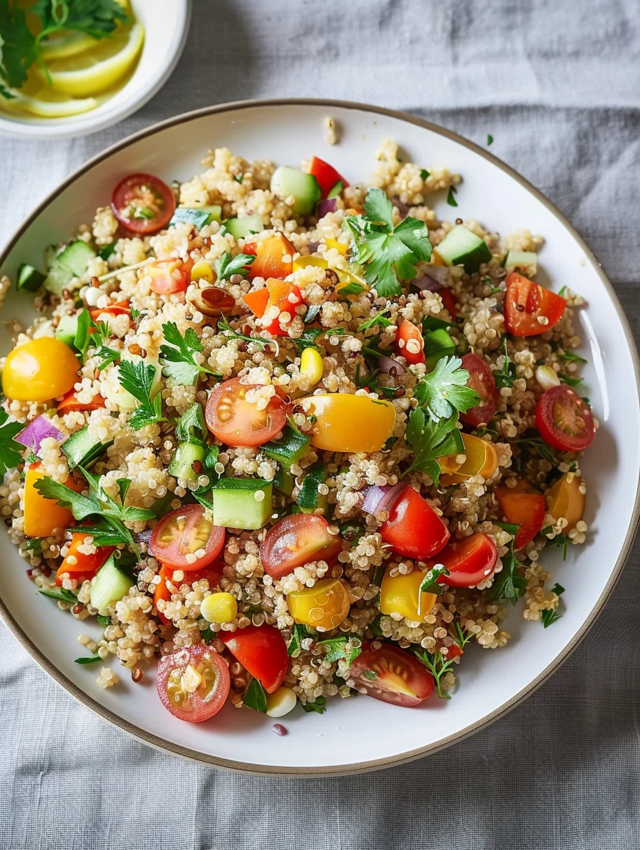 1. Nutritious Ingredients – The combination of quinoa, fresh vegetables, and a zesty dressing creates a nutrient-rich meal.