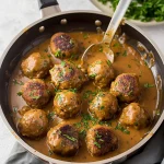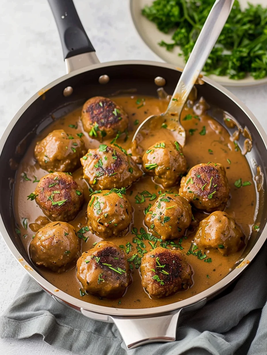 7. Return Meatballs to Skillet: Gently add the browned meatballs back into the skillet, ensuring they are coated in the gravy. Simmer for 5-10 minutes until heated through.